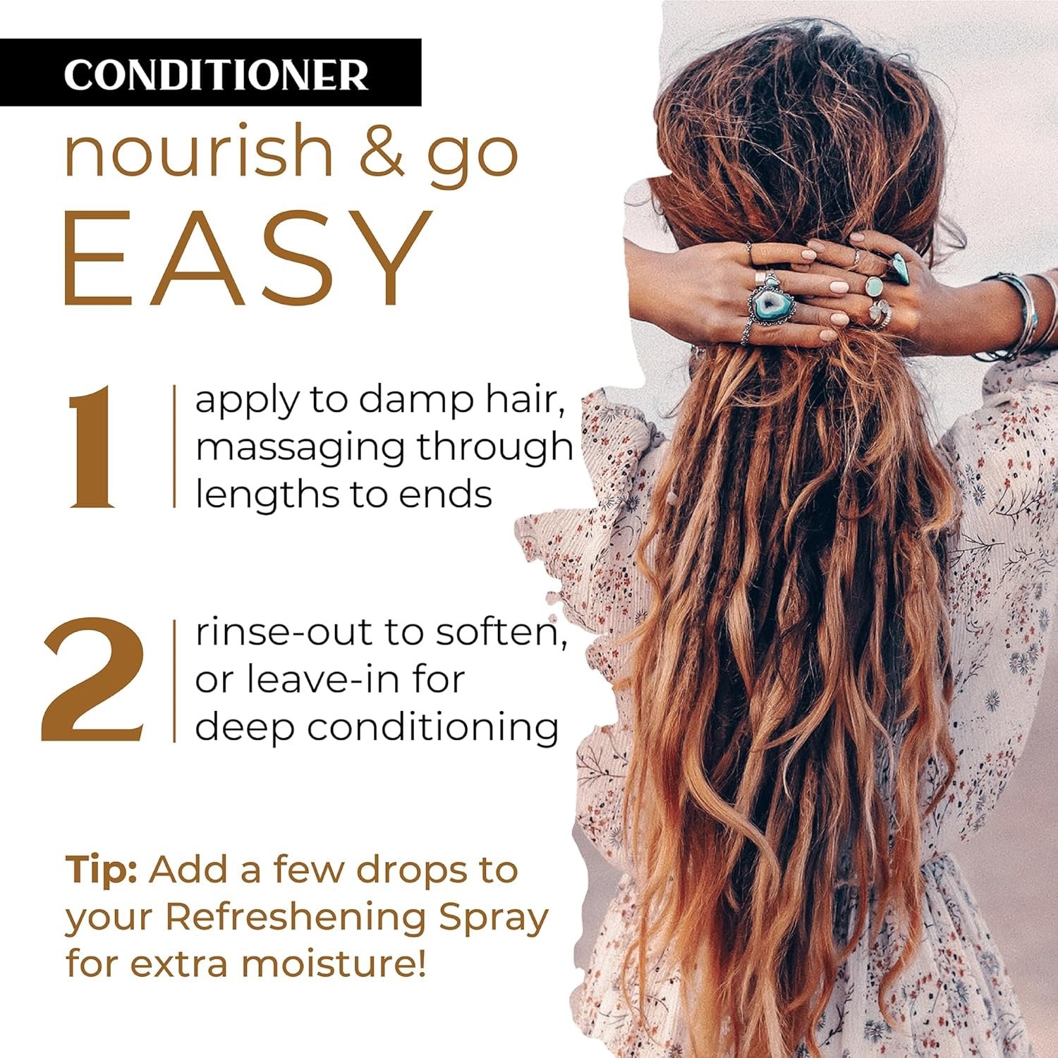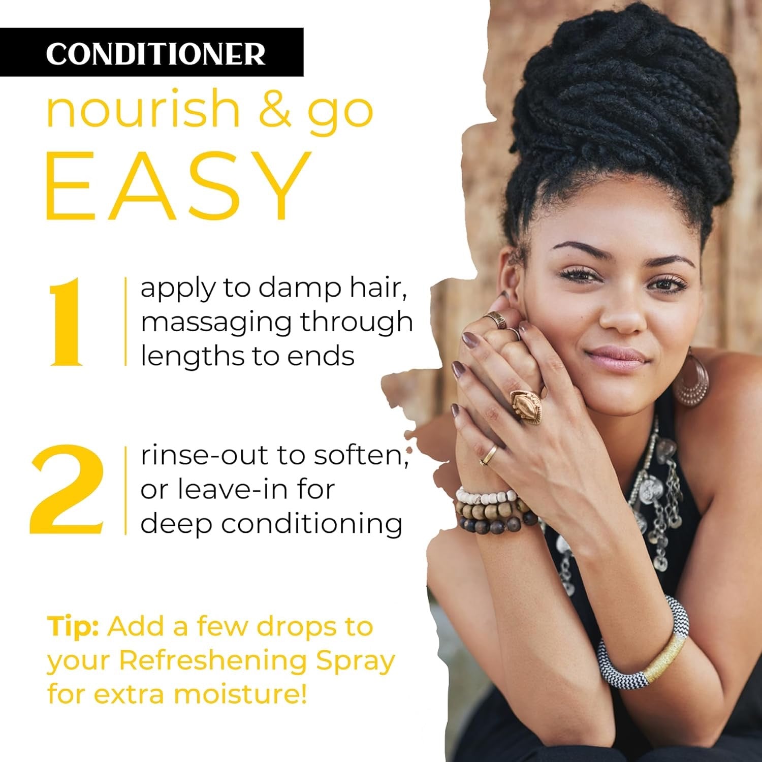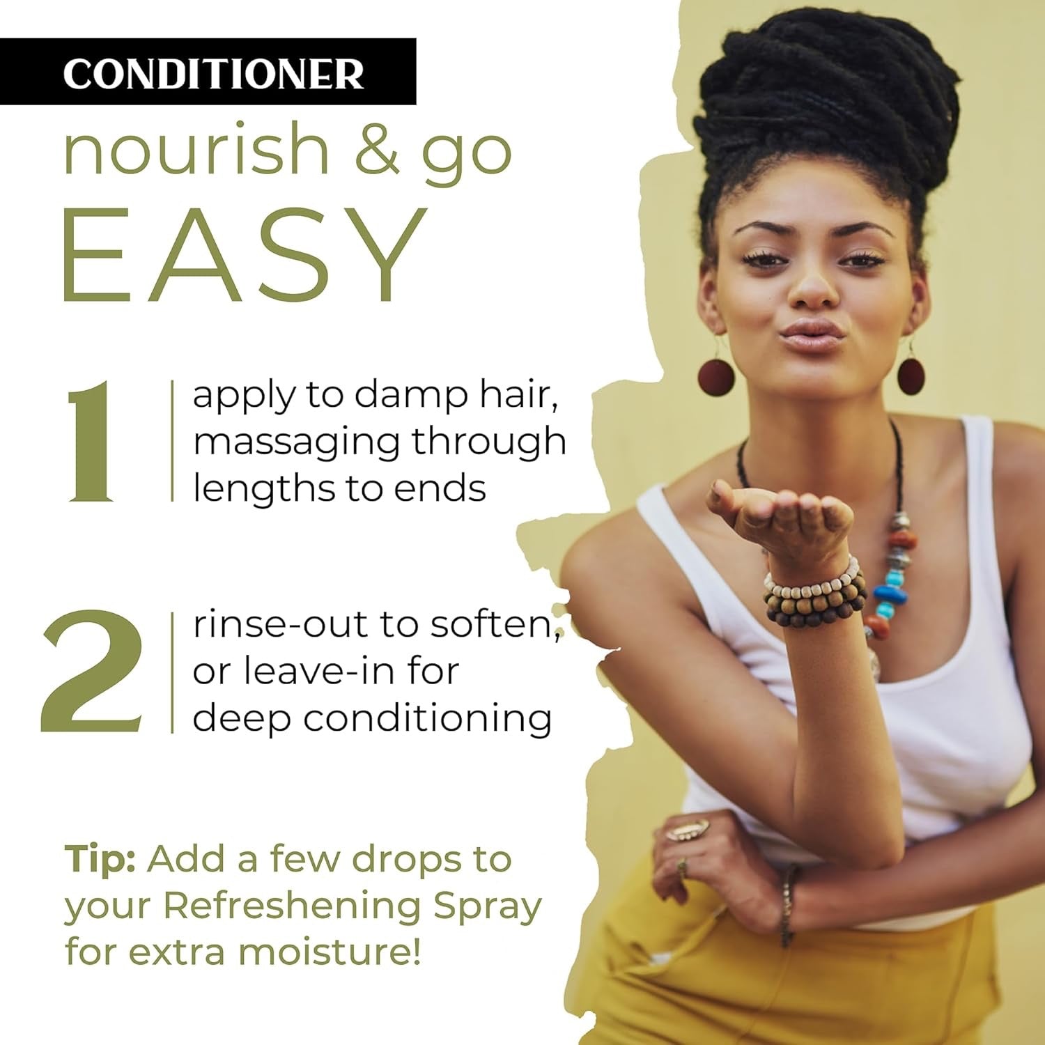 A pH-balanced, versatile, lightweight conditioner designed to revitalize any hair type or texture: dreadlocks, brushable natural hair, and faux textures and formulated to replenish moisture and strengthen hair, preventing breakage and damage while leaving your hair feeling healthy, shiny, and soft without any buildup.