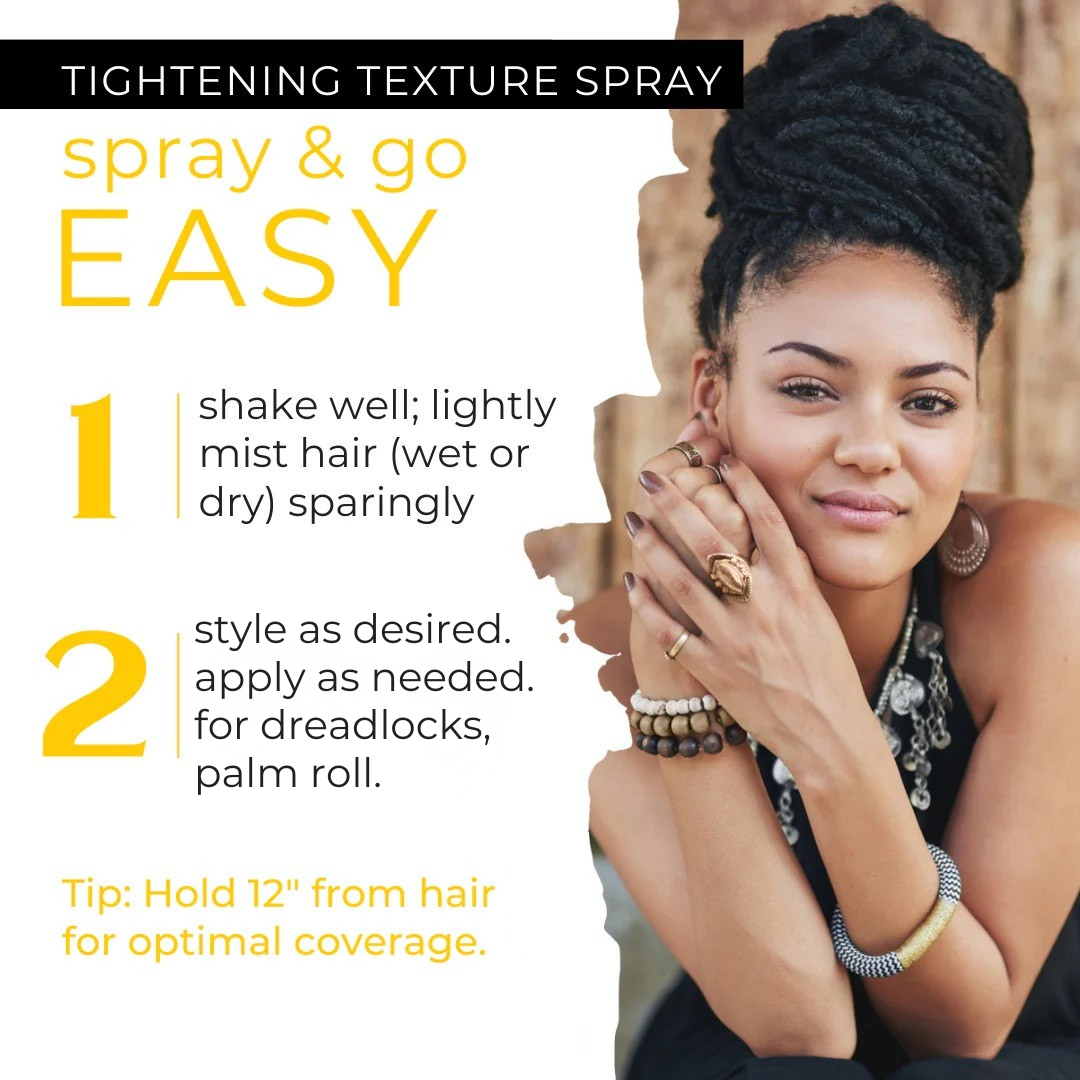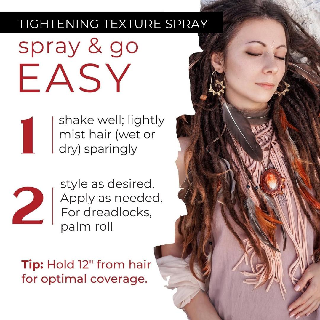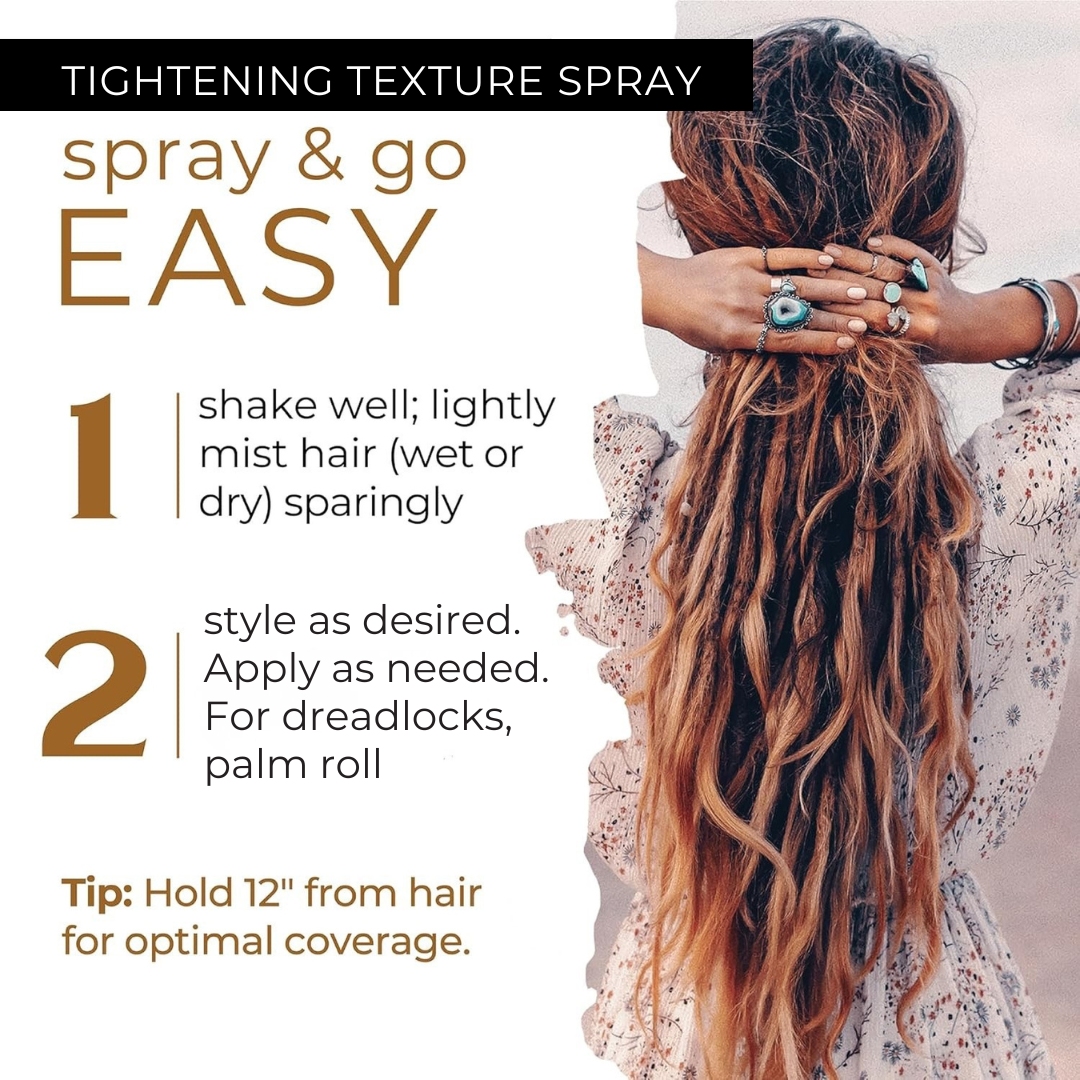 The Dollylocks Tightening Spray helps reduce frizz and flyaways while nourishing your hair, enhancing texture, and speeding up the locking process—perfect for palm rolling and maintaining healthy, beautiful dreadlocks at any stage.