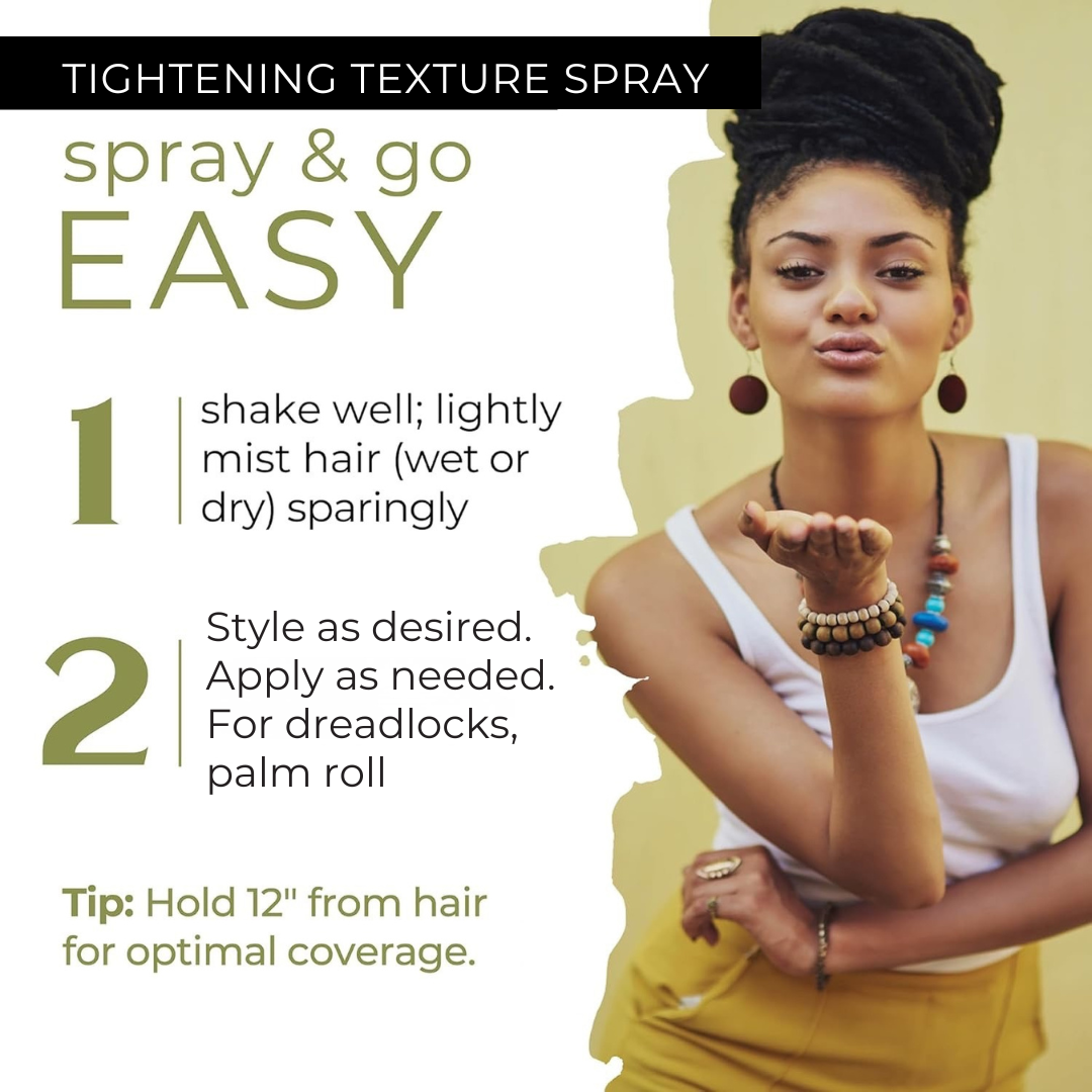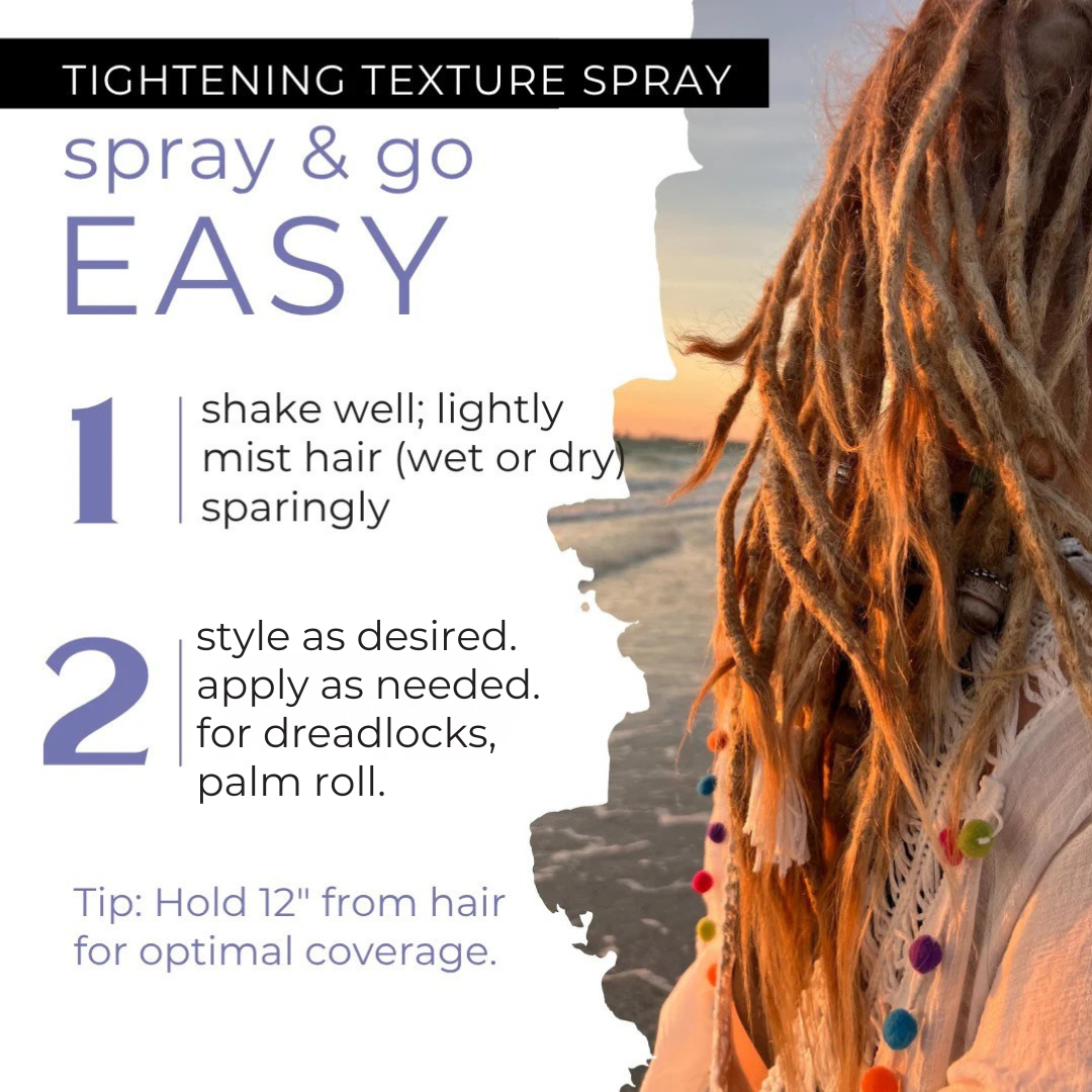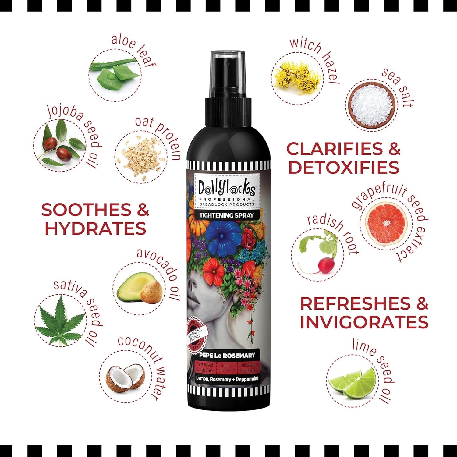 The Dollylocks Tightening Spray helps reduce frizz and flyaways while nourishing your hair, enhancing texture, and speeding up the locking process—perfect for palm rolling and maintaining healthy, beautiful dreadlocks at any stage.