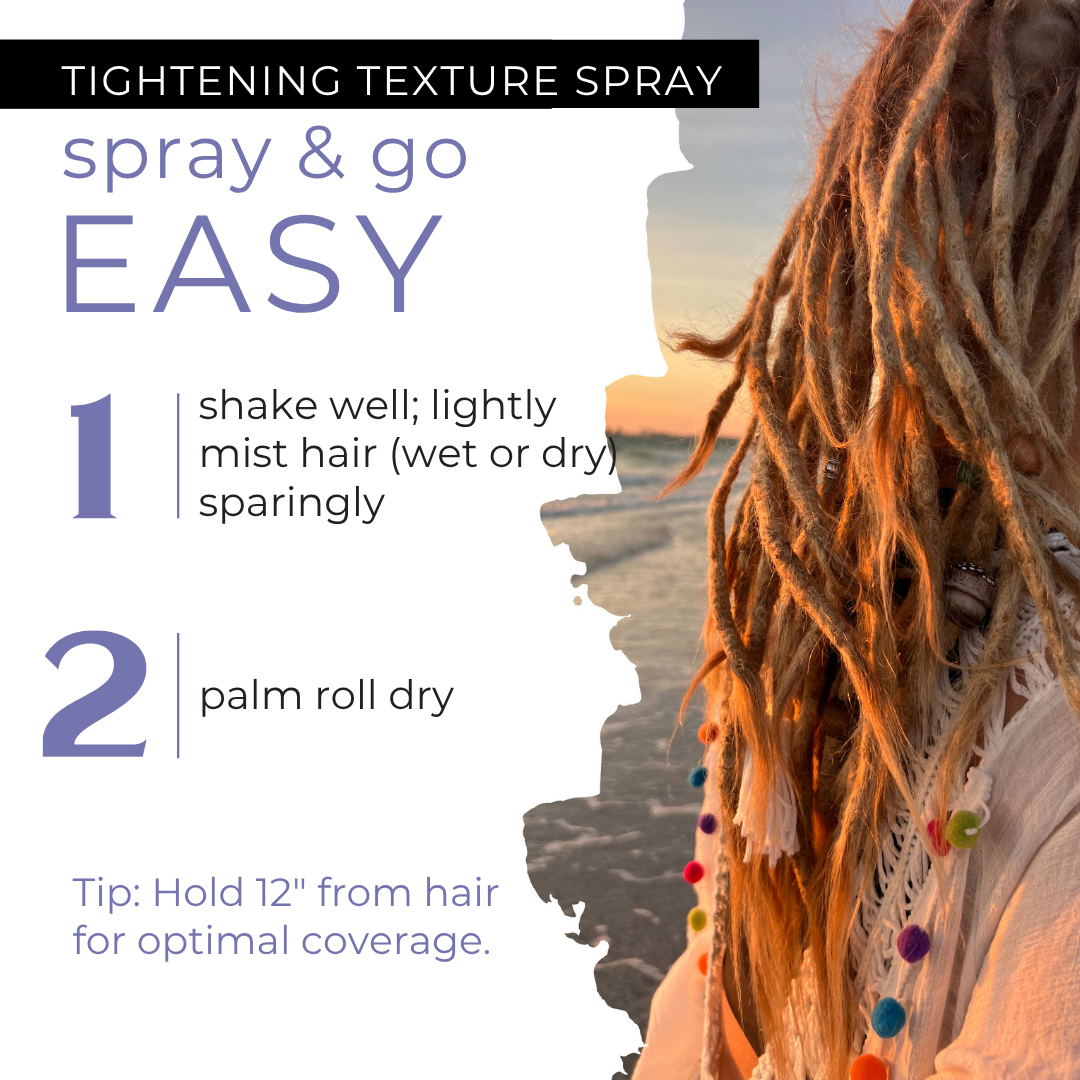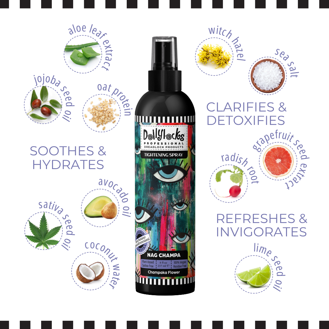 The Dollylocks Tightening Spray helps reduce frizz and flyaways while nourishing your hair, enhancing texture, and speeding up the locking process—perfect for palm rolling and maintaining healthy, beautiful dreadlocks at any stage.