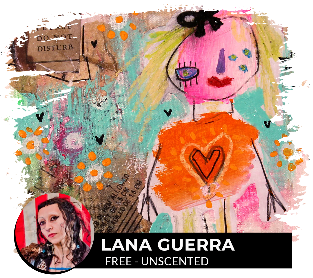 We’re thrilled to spotlight Lana Guerra, the artist behind the label for our FREE (Unscented) line. Based in New Orleans, Louisiana, Guerra brings her vivid imagination to life through a childlike yet strikingly complex style often described as “Outsider Art” or “Art Brut.” Drawing inspiration from urban graffiti, primitive masks, antique dolls, occult art, and the weathered charm of decaying architecture, Guerra weaves themes of childhood, circus sideshows, New Orleans Voodoo, and raw creativity into her work.