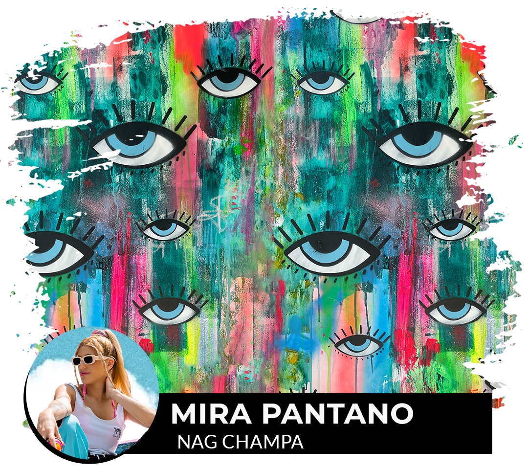Miranda Pantano, widely known as Mira from Miami, is the talented mixed media painter, muralist, and designer behind the striking artwork for our Nag Champa label. Mira’s urban pop chic style seamlessly blends vibrant visuals with satirical storytelling, centering on themes of women empowerment and spiritual enlightenment. Influenced by street art, retro objects, and vintage imagery, her artwork often carries positive messages with layers of deeper meaning.