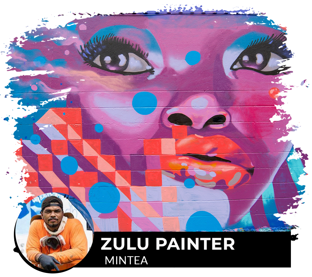 Zulu Painter, the creator of our Mintea label, is an international multi-media artist known for his versatile talent across traditional mediums, body paint, special effects, and scenic art. His motto, “I want to grow Art everywhere,” reflects his dedication to creating “Mindful Murals for all to enjoy,” which he brings to life in large-scale mural work seen across the United States. These vibrant murals are more than just art; they are part of the art revitalization in communities across the country, spreading positive energy and uplifting viewers with each piece.