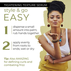 TO USE: dispense a small amount into palm, rub hands together applying evenly from roots to ends focusing on a small section at a time - scrunch for curls. Can be applied to wet or dry hair. Use as needed.