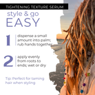 Residue-free hold adding texture and volume to all hair types and textures, including dreadlocks, locs, braids, faux styles, curly hair, and brushable hair.