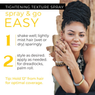 TO USE: Shake well and lightly mist damp or dry hair. Style as desired. Apply sparingly as needed. For dreadlocks, palm roll after for best results.